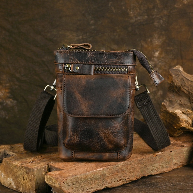 Genuine Leather Men's Waist Bag - Anti-Theft 7-Inch Phone Crossbody Bag with Adjustable Strap, Large Capacity & Hook Closure, Casual Outdoor Sports & Daily Commute Bag for Men, Leather Crossbody Bag, Vintage Leather Look, Secure Zipper Closure